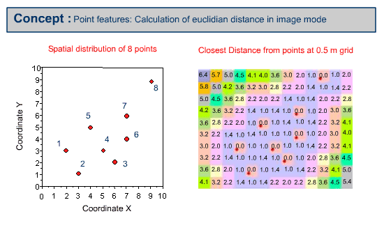 Closest distances can be calculated from the point features using Euclidian distance. The following example is calculated based on the on the point distribution map illustrated to the 0.5 m raster grid.