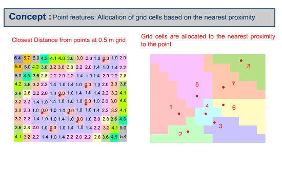 Then raster grid cells are allocated to the properties of point features based on the nearest proximity from the point feature (Thiessen's region).