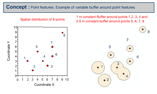 Buffer polygon or polygons can be created by using a constant buffer distance or variable buffer distance around the specified input point feature.