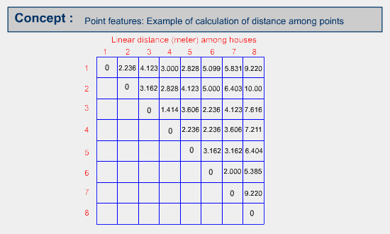 The following is the result of calculating distances among point features or houses. The distance between a point and itself is 0.