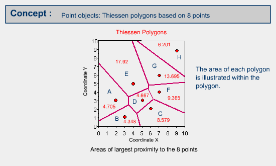 Generate the Thiessen Polygons, using the available GIS software from your GIS Lab based on the point distribution map illustrated. The output area values should be similar to the values mentioned in the example illustration.