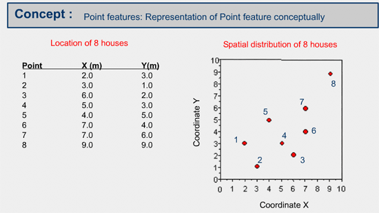 Point features can be described as single x, y values in object mode or single column, row values in image mode.