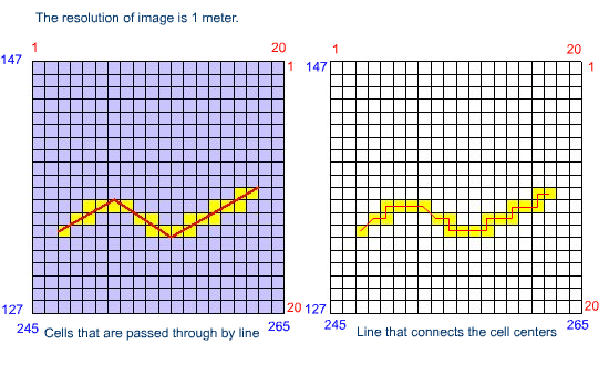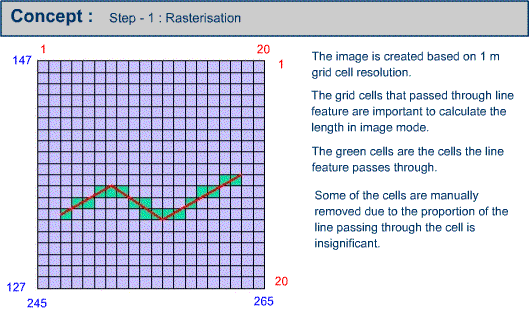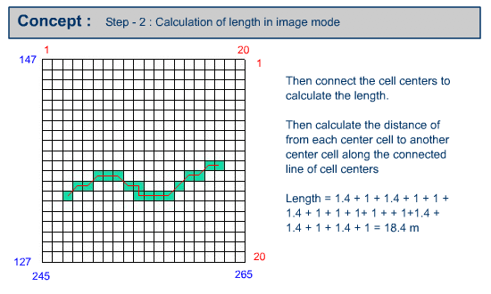 Calculate the length of the linear feature in image mode based on the following presentation. In this presentation, all the cells that are passed through by the line significantly and insignificantly are considered for calculation of length in image mode.