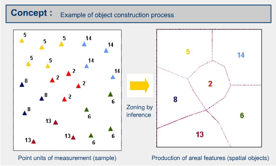• To derive spatial features from the spatial distribution of measured properties: This process of object construction is called regionalization in the strictest sense.