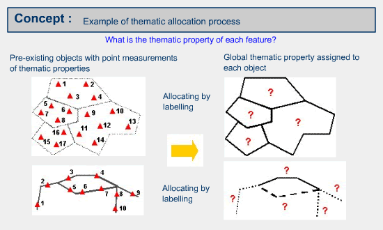 • To assign a global thematic property to each spatial object from a pre-existing set, based on sample data: This process is called thematic allocation or labelling and can be considered as part of the regionalization.